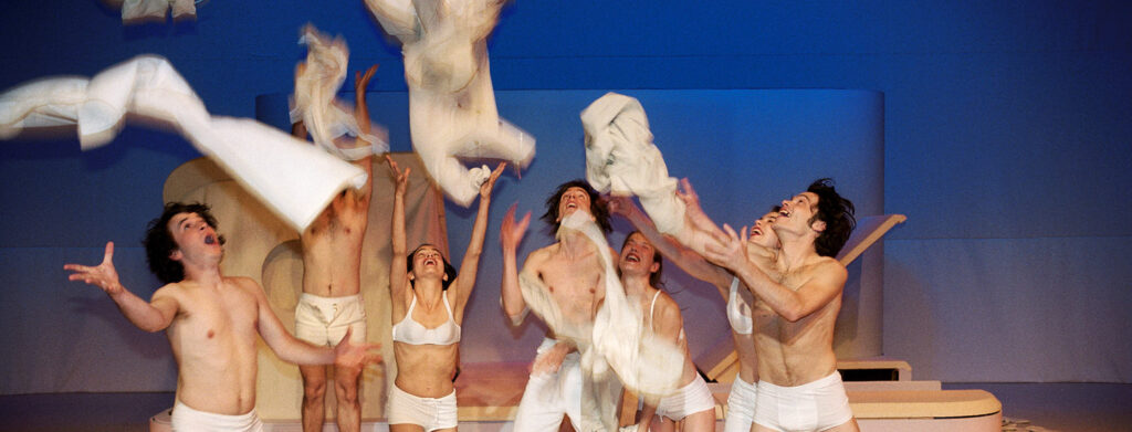 …Fast scheinen die Darsteller in ihren weiß, creme und beige getönten Kunstuniformen, verfremdeter Alltagskleidung, mit dem weißen Bühnenbild zu verschmelzen – sie wollen sich nicht in den Vordergrund drängen, weder farblich noch durch übertriebene Dramatik. Sie bleiben charmante Vortänzer und spleenige Opfer der Dinge und verschwinden auch gerne in den Klappen, Ritzen und Zelten, die sich im Bühnenbau auftun…